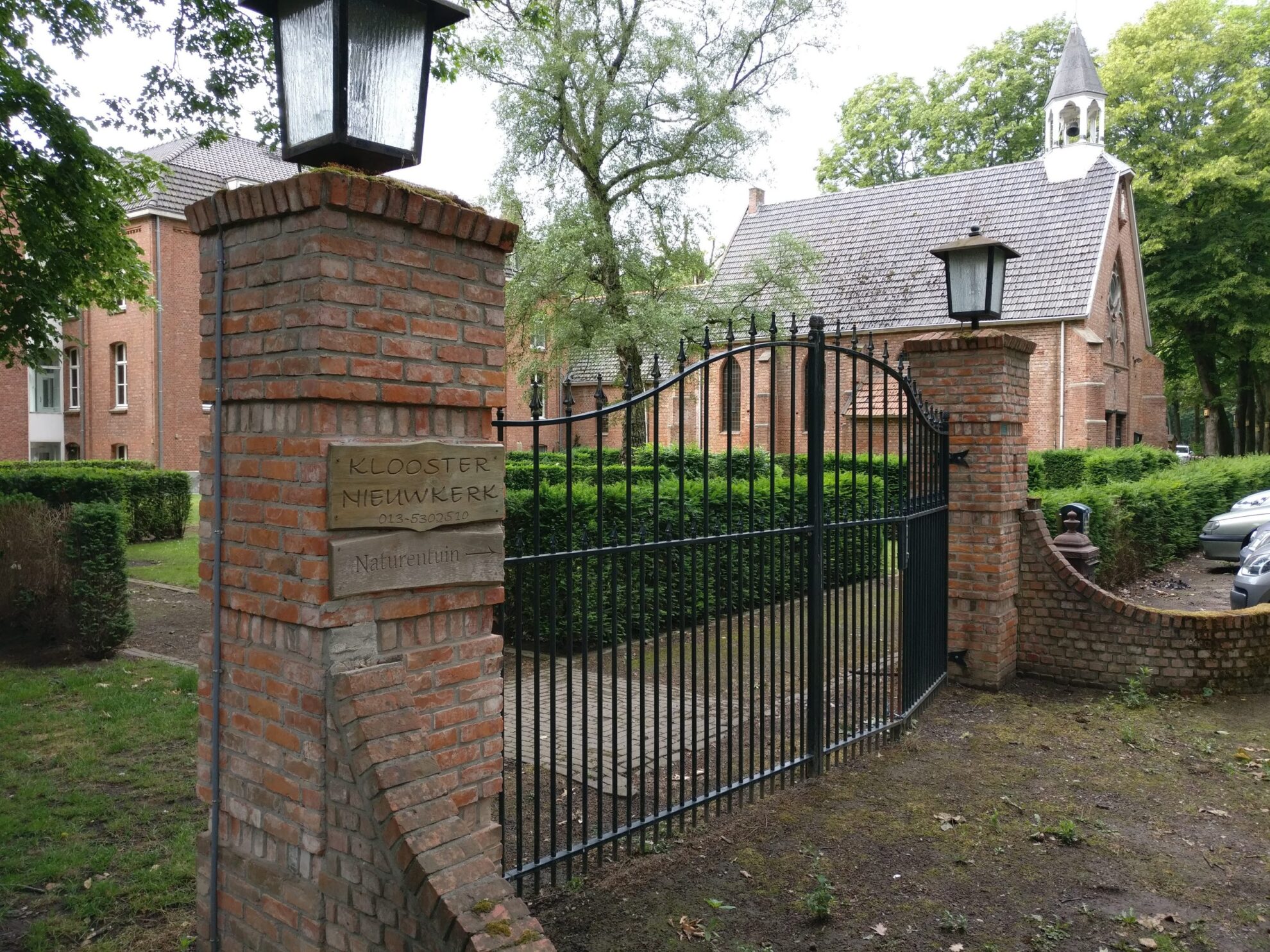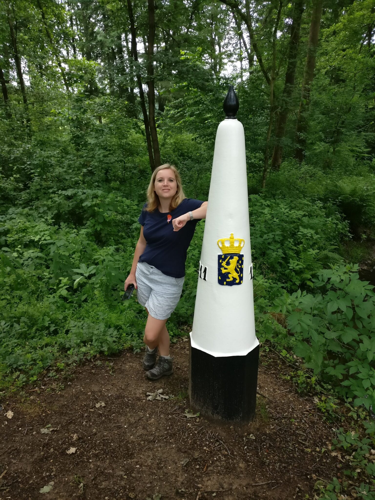 Op de zondag besluiten we naar het nabijgelegen landgoed Nieuwkerk te gaan. Eigenlijk is het gewoon een kwestie van de straat oversteken en dan ben je er al. De Belgisch-Nederlandse grens doorkruist dit landgoed. We besluiten eerst naar het klooster te lopen en vanaf daar een route uit te stippelen. Richting het klooster lopen we letterlijk op de grens. Er staat nog een vers geschilderde grenspaal om je daar aan te herinneren.